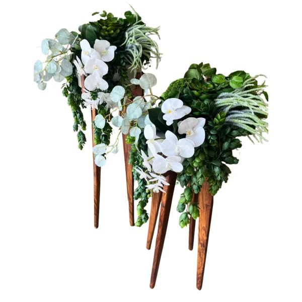 Jarrones con orquídeas blancas, suculentas y follaje verde sobre bases de madera oscura. Aportan frescura, naturalidad y un toque sofisticado a tu espacio. Grande 130 de alto x 50 de ancho. Chico 110 de alto x 50 de ancho.