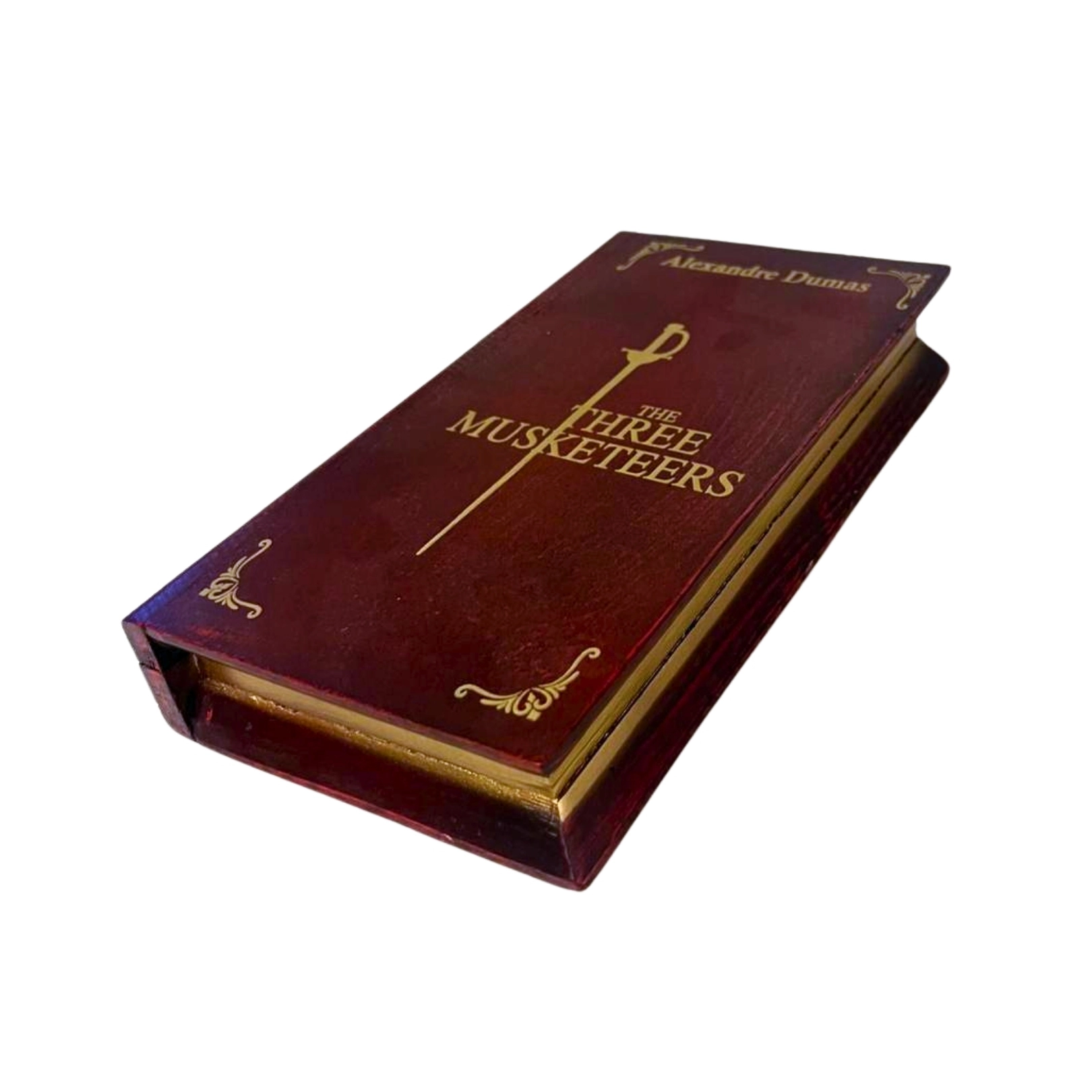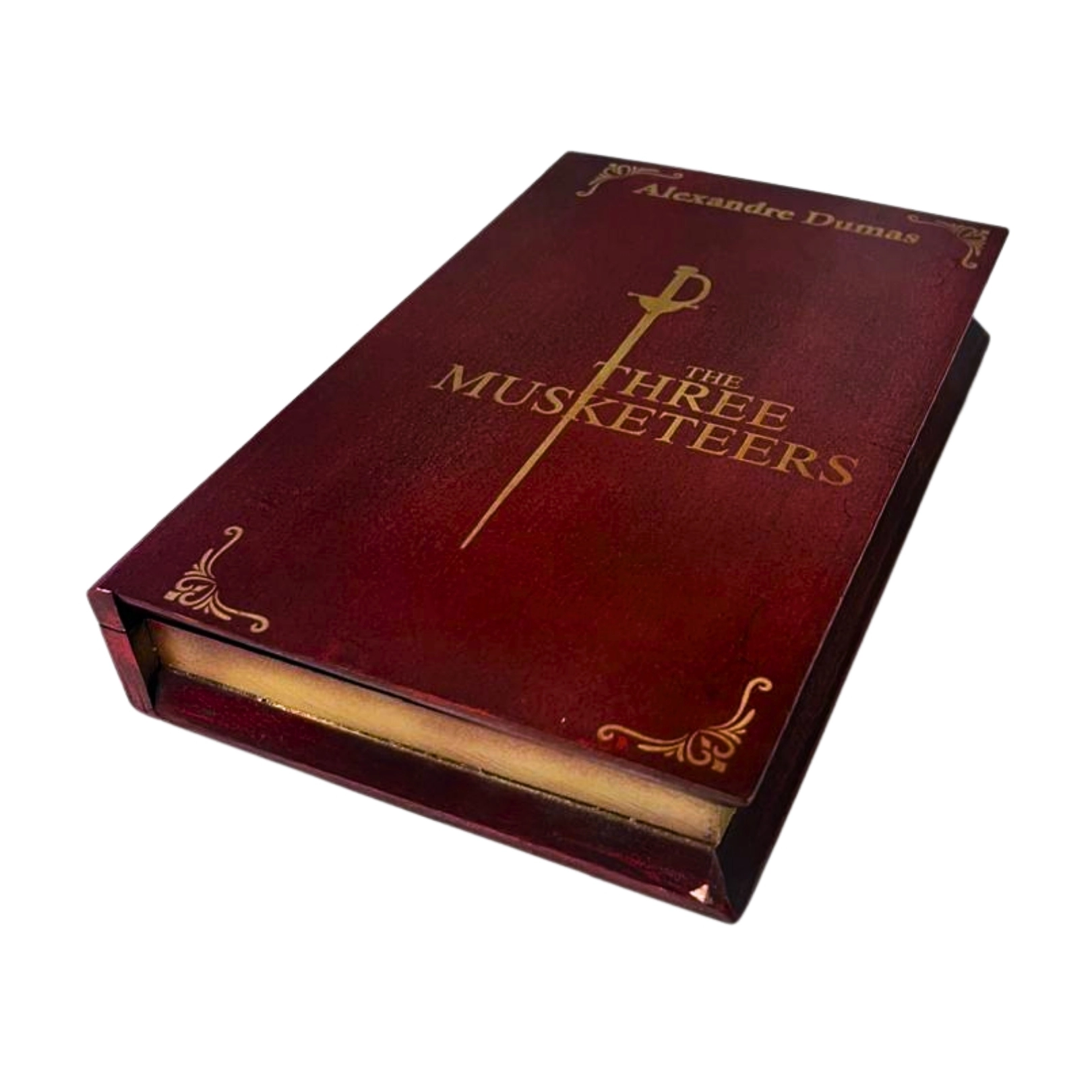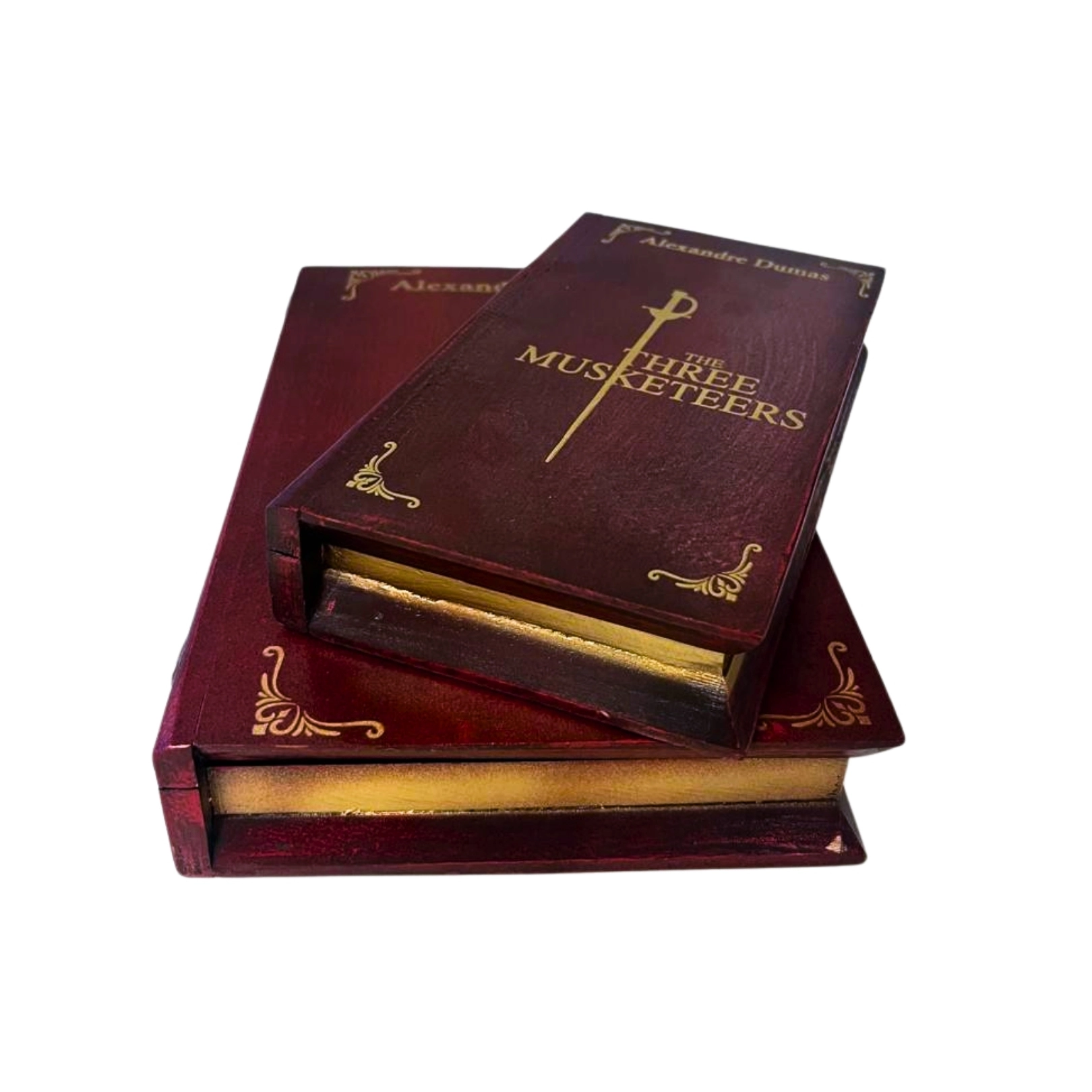 Set de libros decorativos inspirados en Los Tres Mosqueteros. Perfectos para realzar estanterías o mesas con un toque elegante. Medidas: Grande 27×18×5 cm y Chico 23×12×4 cm