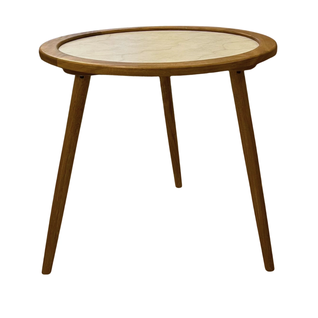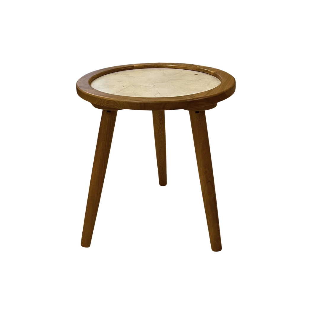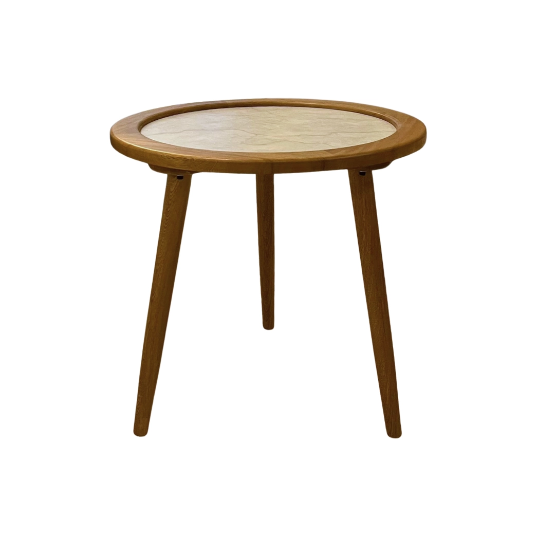 Mesa lateral redonda de madera con patas metálicas oscuras. Ideal para espacios modernos.