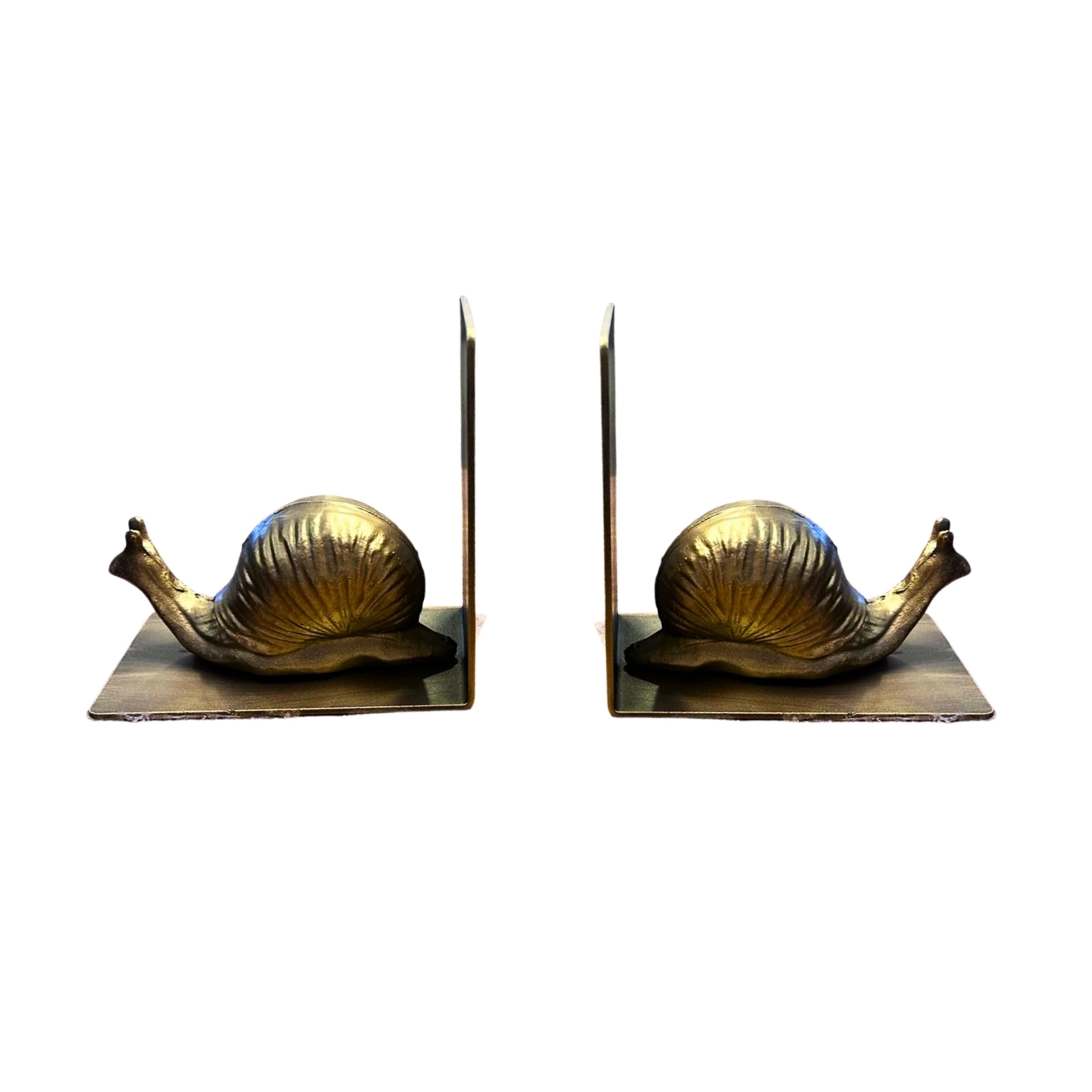 Portalibros dorados en forma de caracol, ideales para mantener tus libros ordenados con estilo.