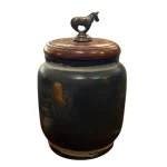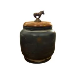 Bote de cerámica oscura con tapa decorada con un caballo de metal envejecido. Ideal para almacenar objetos con estilo. Grande 25 de alto x 13 de ancho. Mediano 23 de alto y 13 de ancho. Chico 20 de alto y 13 de ancho