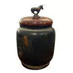 Bote de cerámica oscura con tapa decorada con un caballo de metal envejecido. Ideal para almacenar objetos con estilo. Grande 25 de alto x 13 de ancho. Mediano 23 de alto y 13 de ancho. Chico 20 de alto y 13 de ancho