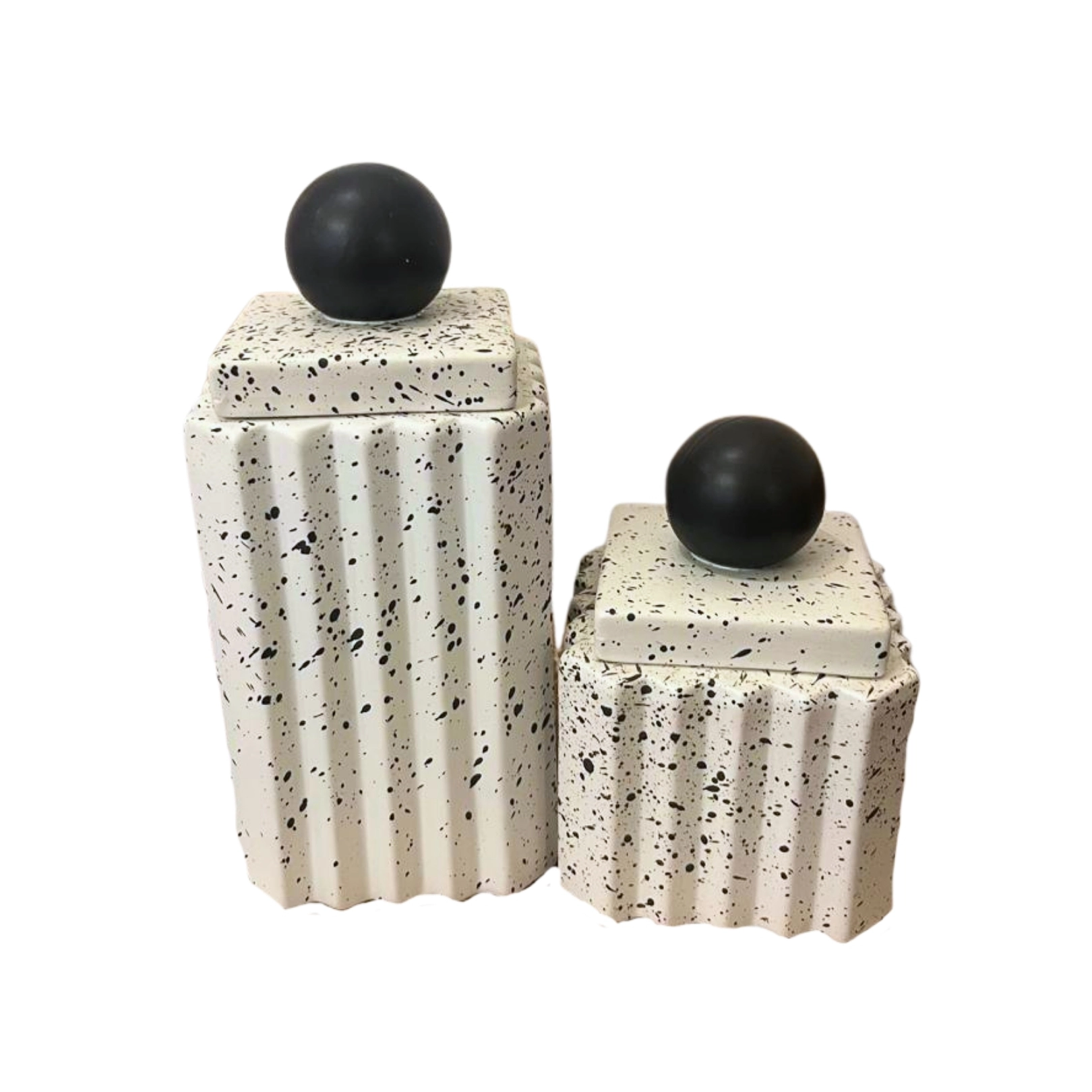 Conjunto de recipientes de cerámica blanca con detalles en manchas negras y tapa esférica. Una pieza ideal para dar un toque moderno y elegante a tu decoración