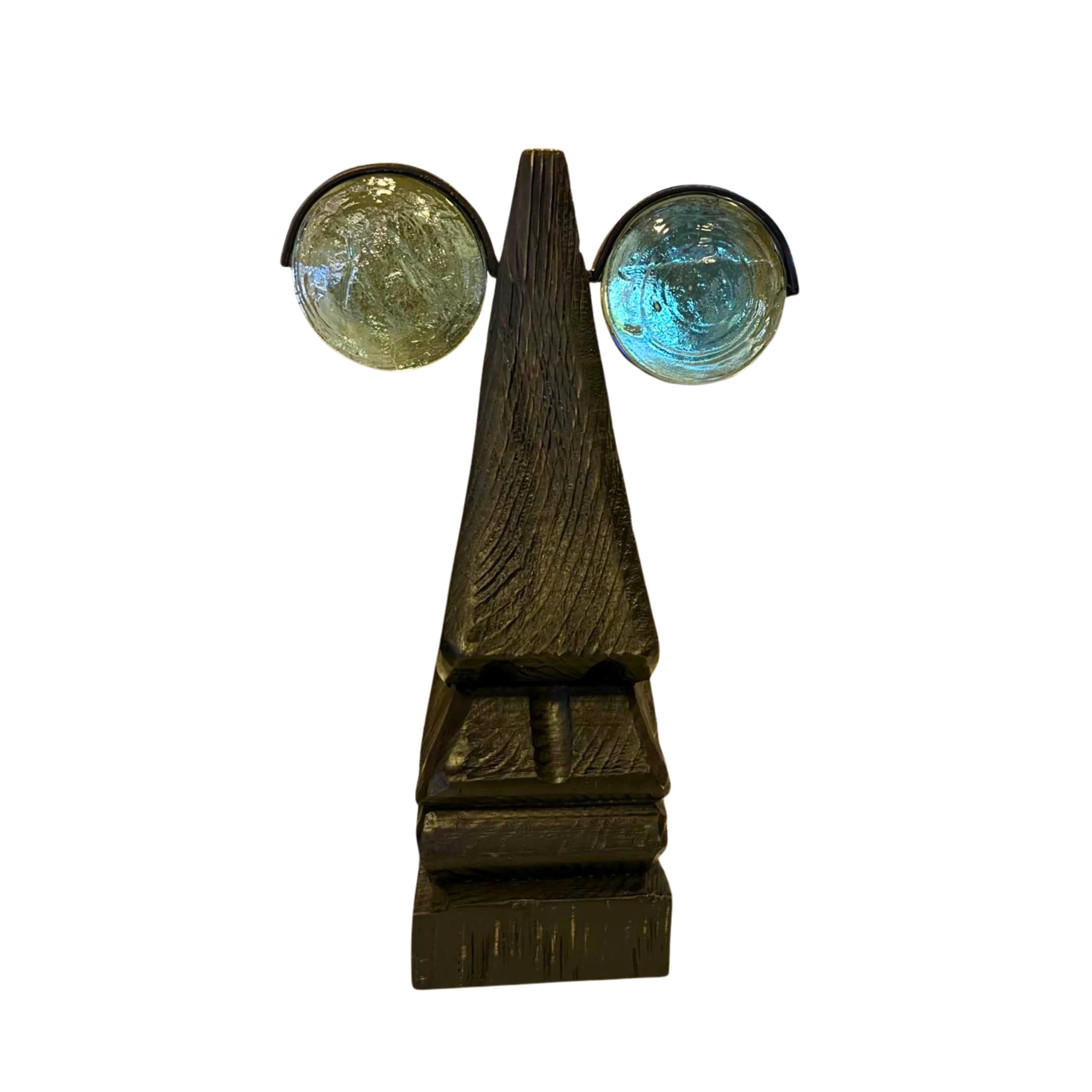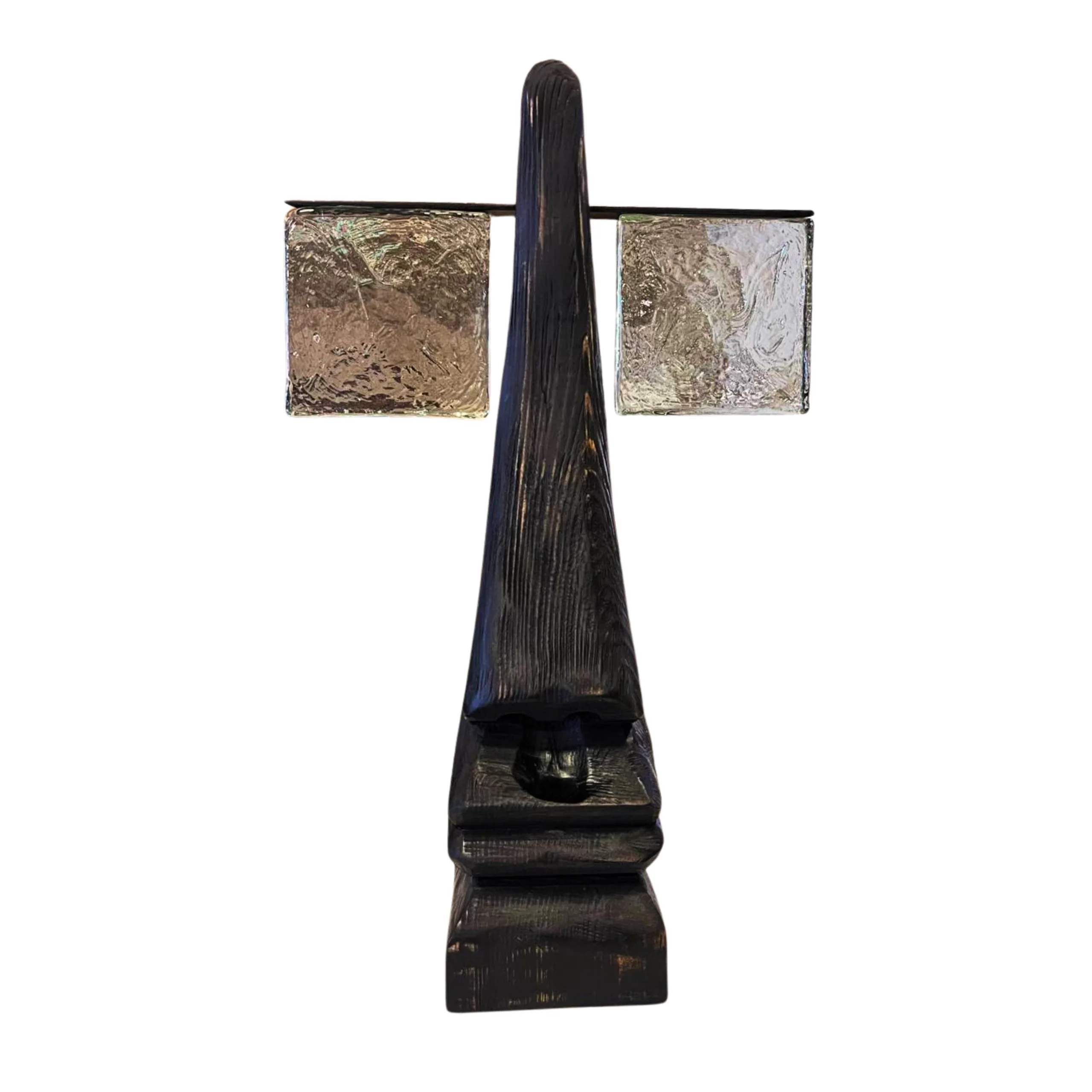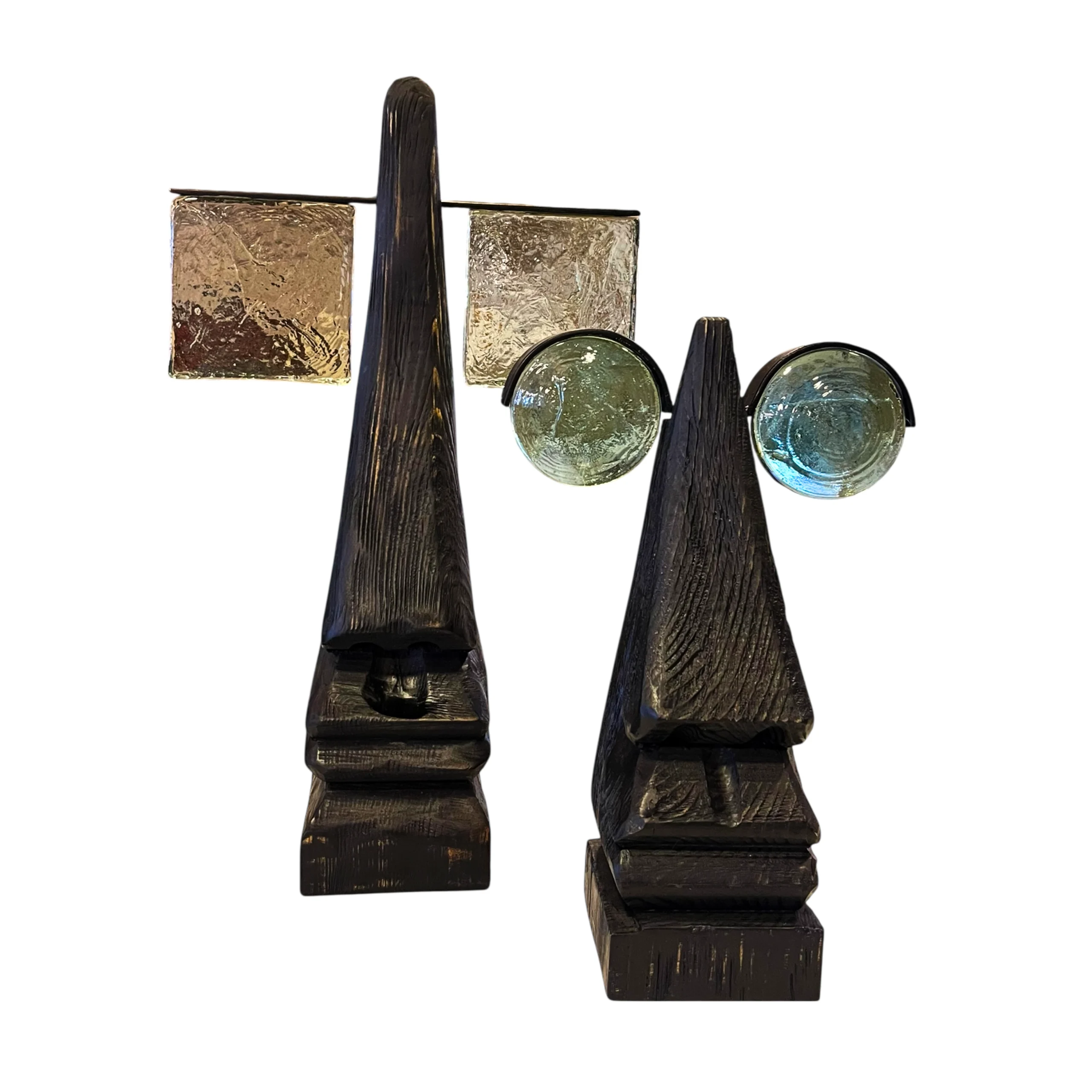 Juego de dos esculturas abstractas de madera oscura, realzadas con detalles de cristal. Un toque moderno y artístico. Grande 44 de alto x 25 de ancho. Chico 31 de alto x 20 de ancho