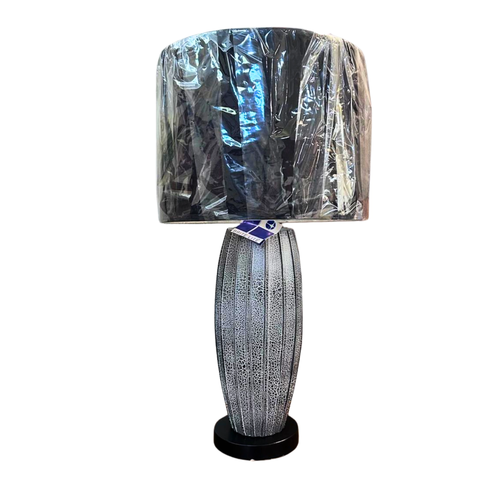 Lámpara de mesa moderna con base ovalada en gris y pantalla cilíndrica negra. Perfecta para un toque elegante.