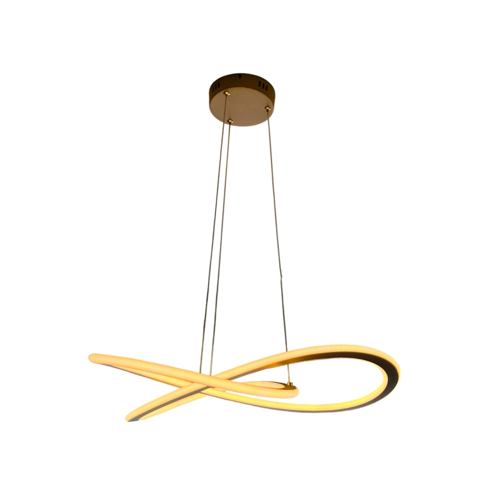 Lámpara colgante moderna con diseño curvo y estructura dorada. Perfecta para añadir un toque sofisticado a cualquier ambiente.