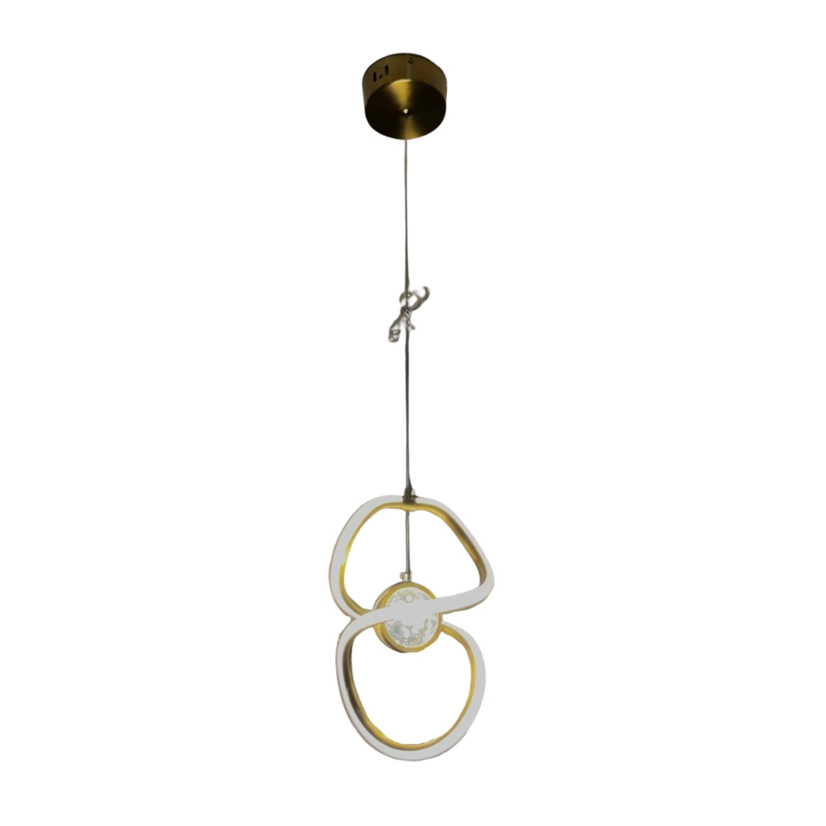 Lámpara colgante moderna con aros dorados y esfera de cristal. Emite luz cálida, perfecta para añadir elegancia a cualquier espacio.
