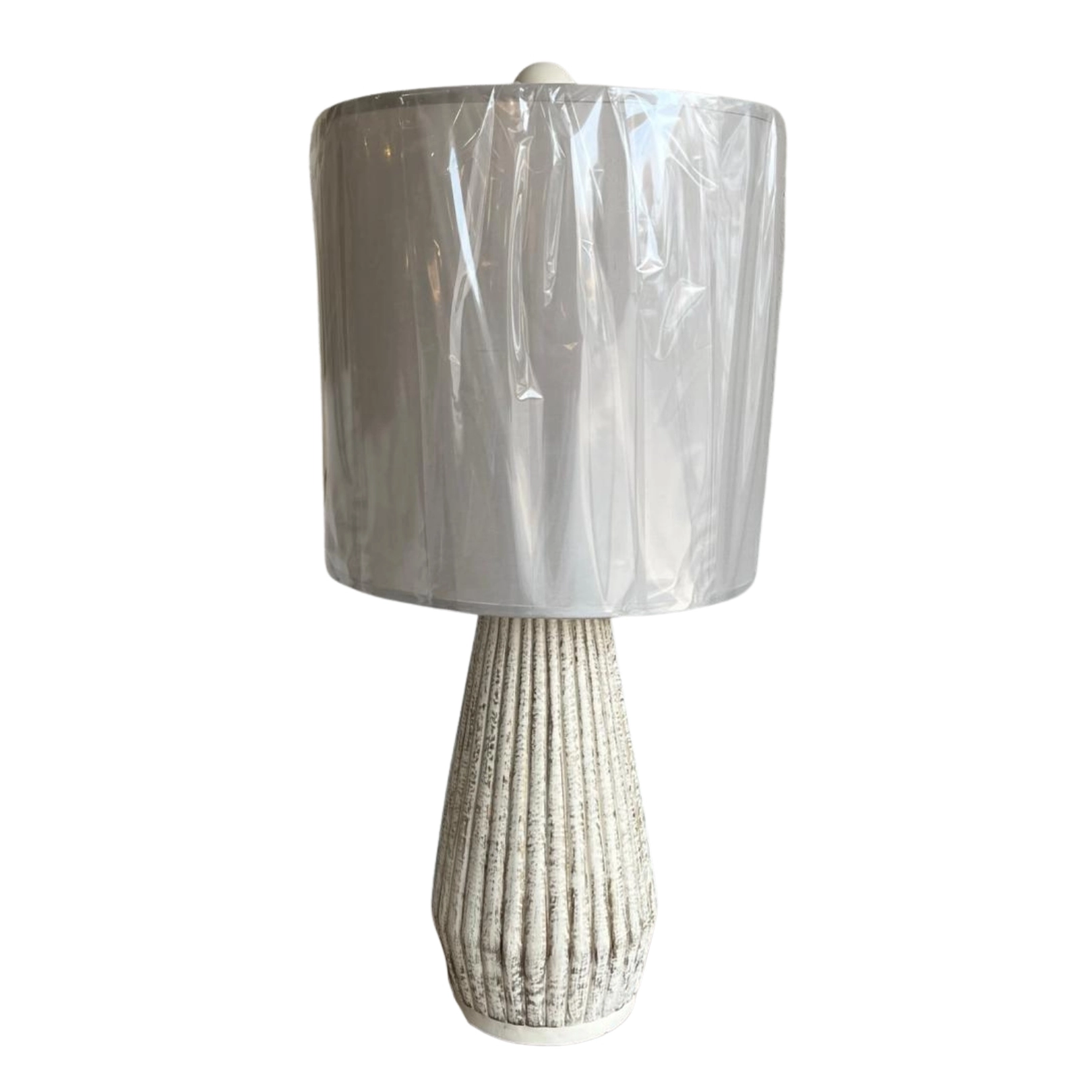 Lámpara de mesa con base de poliresina blanca y pantalla blanca, combina elegancia y calidez.