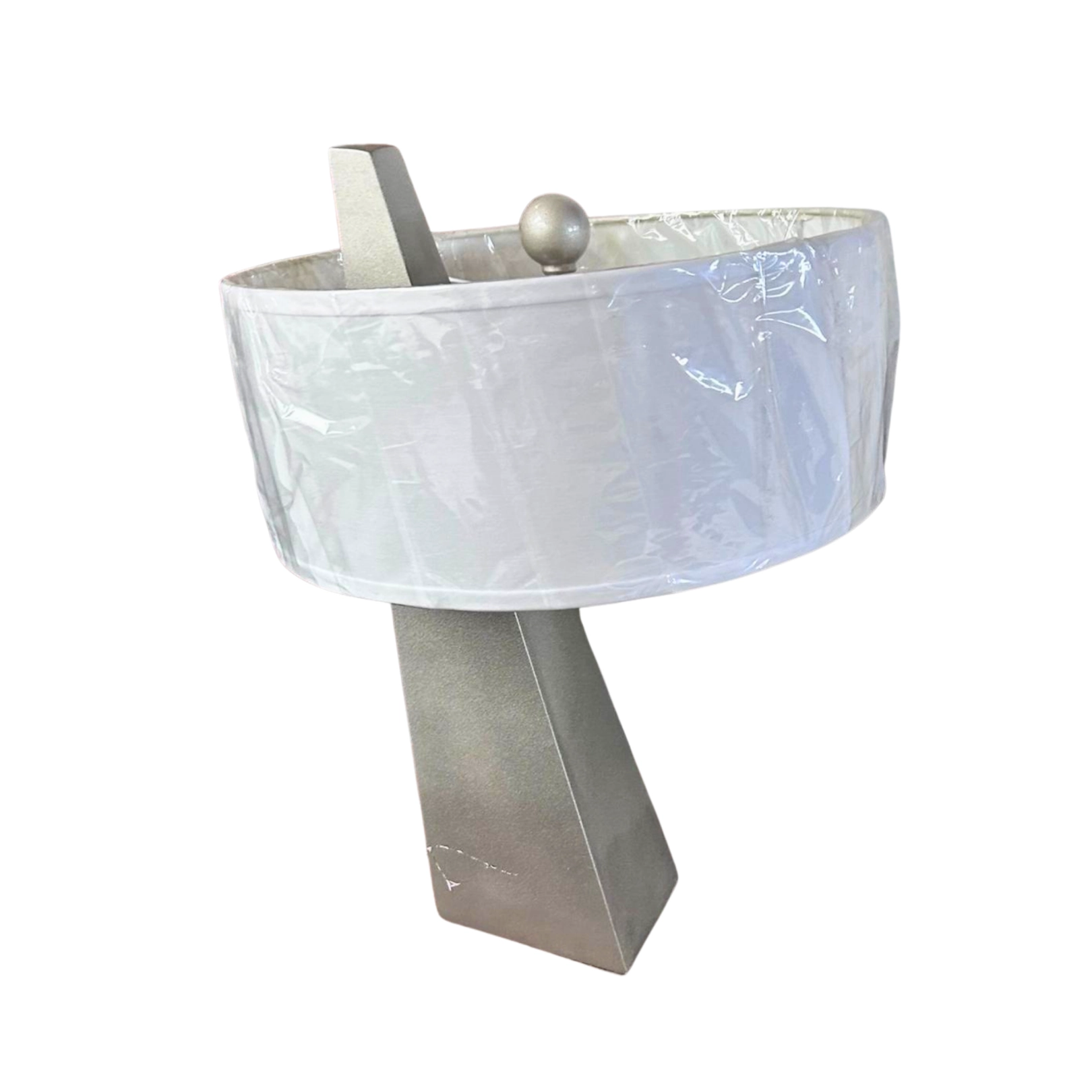 Lámpara de mesa moderna con base geométrica y pantalla cilíndrica, ideal para crear un ambiente acogedor