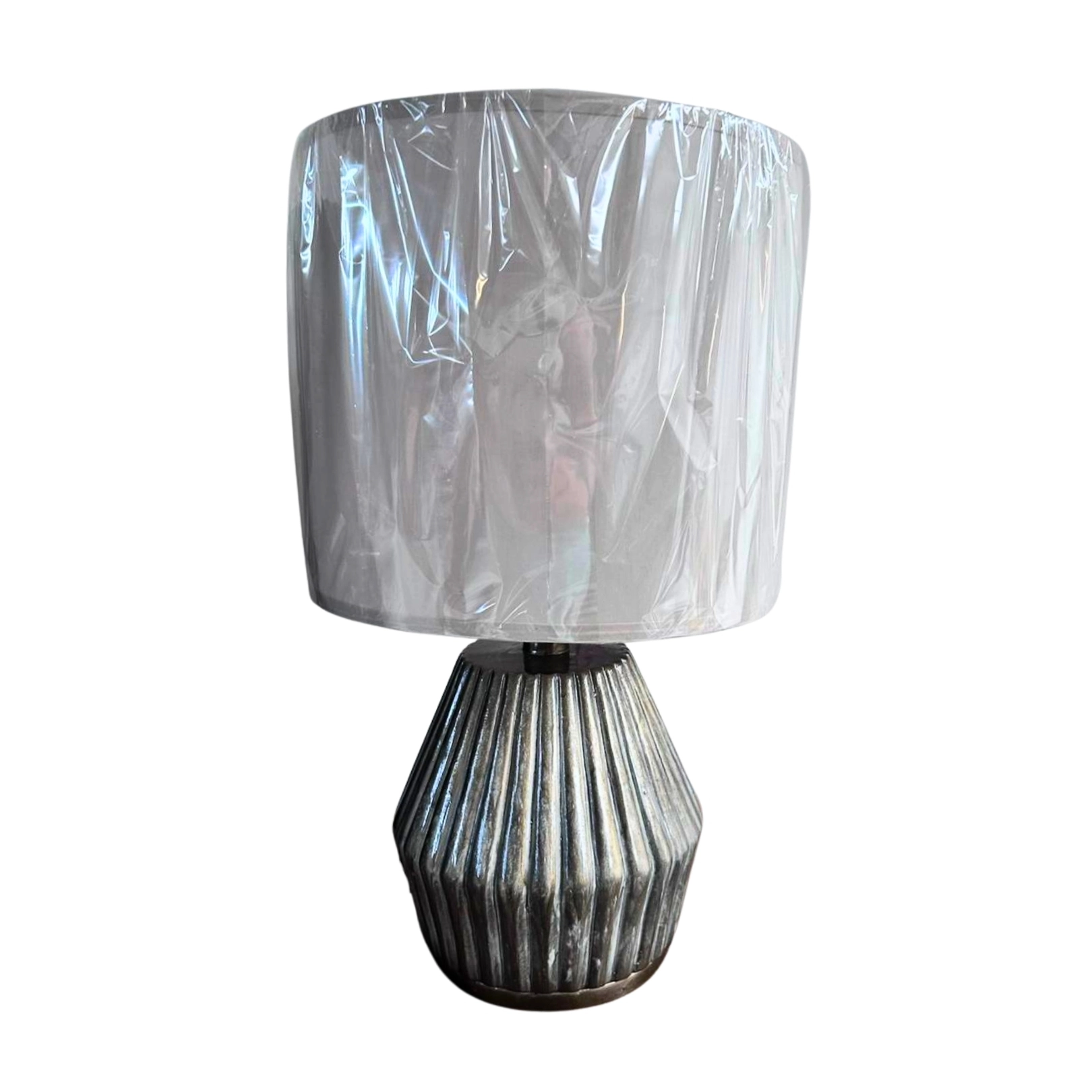Lámpara de mesa con base metálica gris texturizada y pantalla en tono blanco. Diseño moderno para iluminar tu espacio con estilo