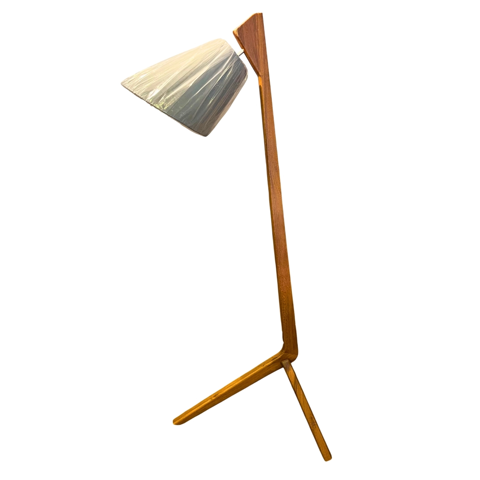 Lámpara de pie moderna con base de trípode de madera y pantalla cónica, perfecta para iluminar cualquier espacio.