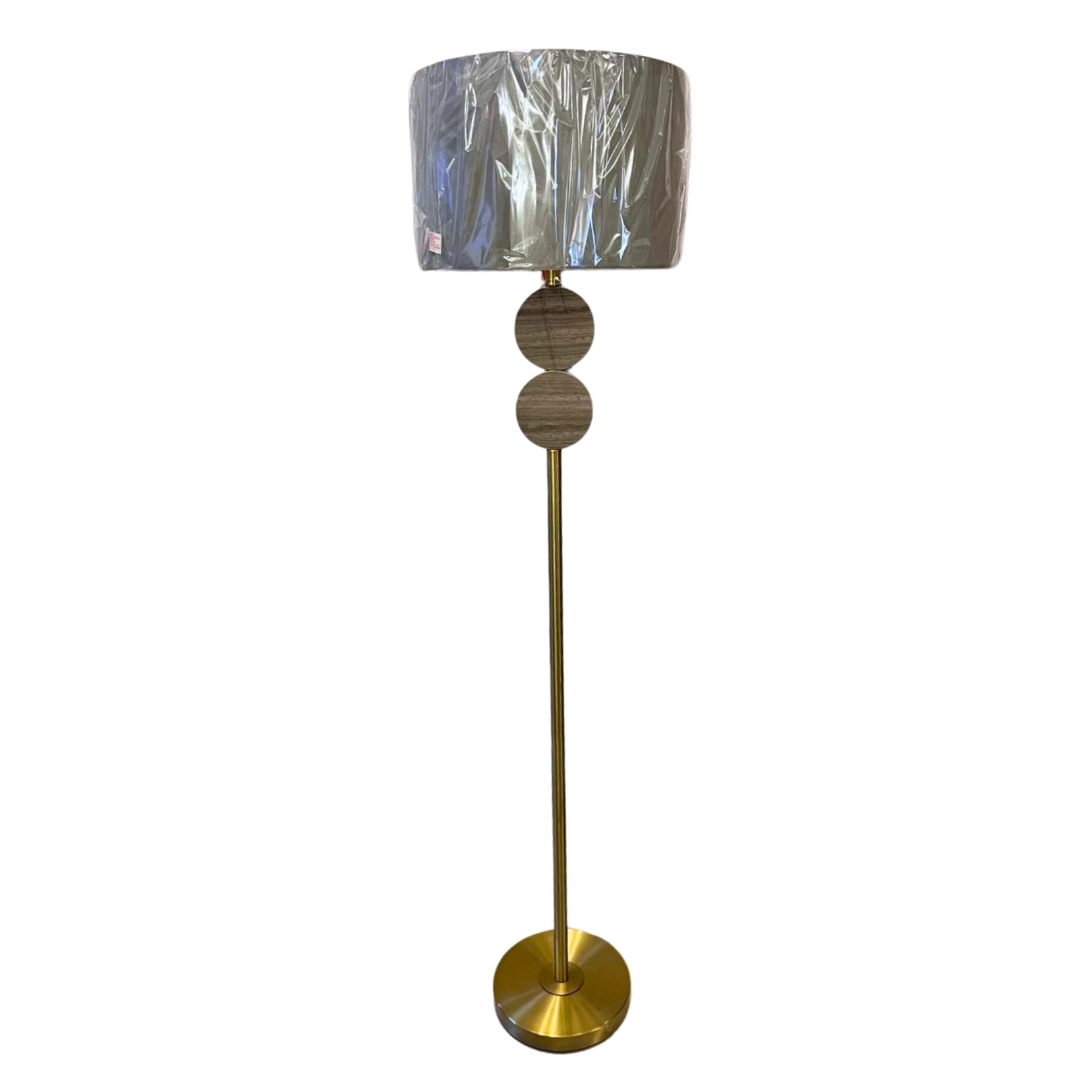 Lámpara de pie moderna con base dorada, pantalla gris y detalles de mármol, perfecta para iluminar y decorar cualquier espacio.