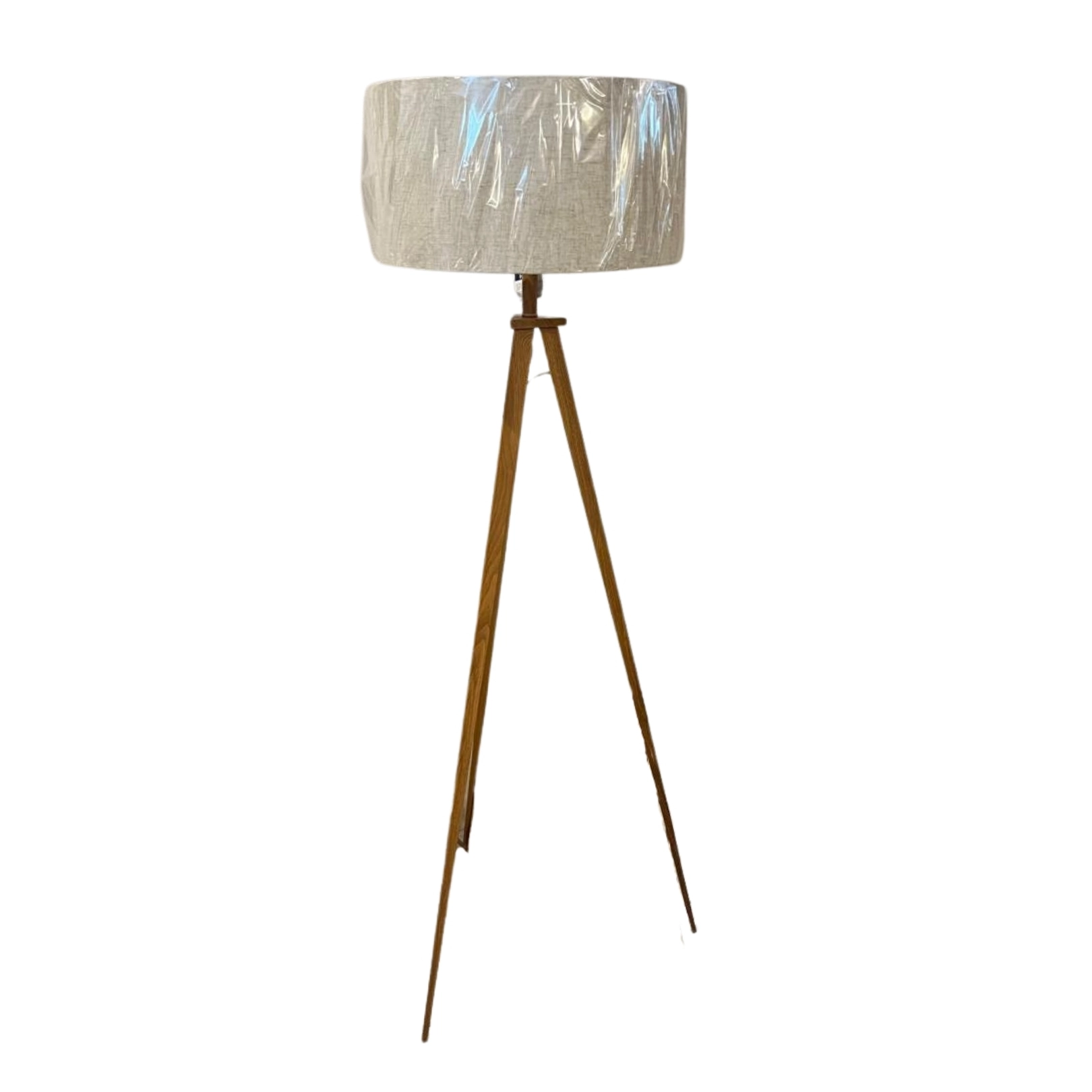 Lámpara de pie trípode de madera con pantalla beige. Elegante y funcional, aporta calidez a cualquier espacio.