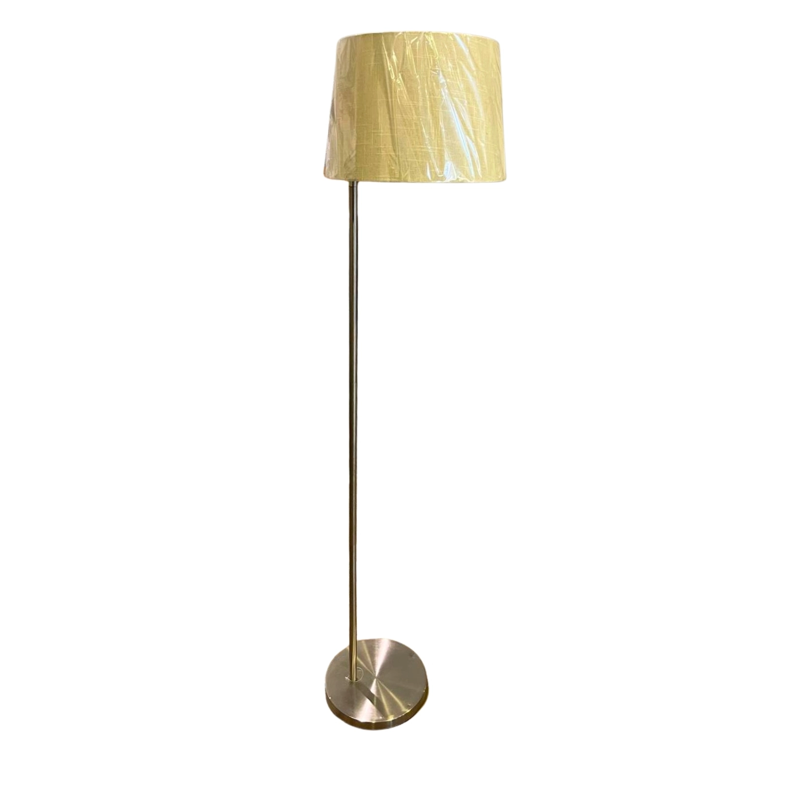 Lámpara de pie moderna con base de metal plateado y pantalla de tela beige, perfecta para un ambiente acogedor.