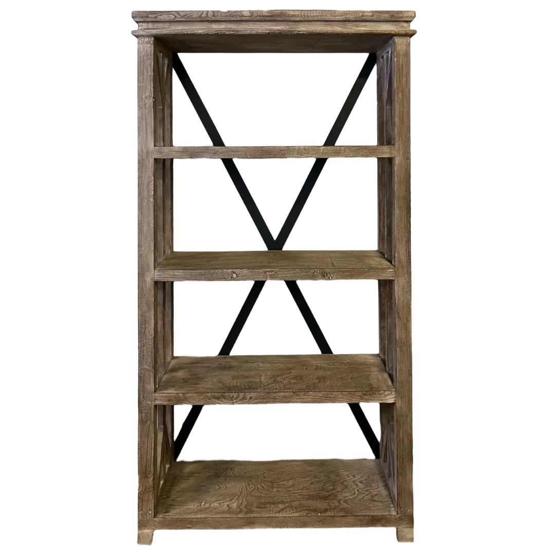Estantería alta de madera gris con acabado rústico y soporte metálico en “X”, perfecta para almacenamiento y decoración.