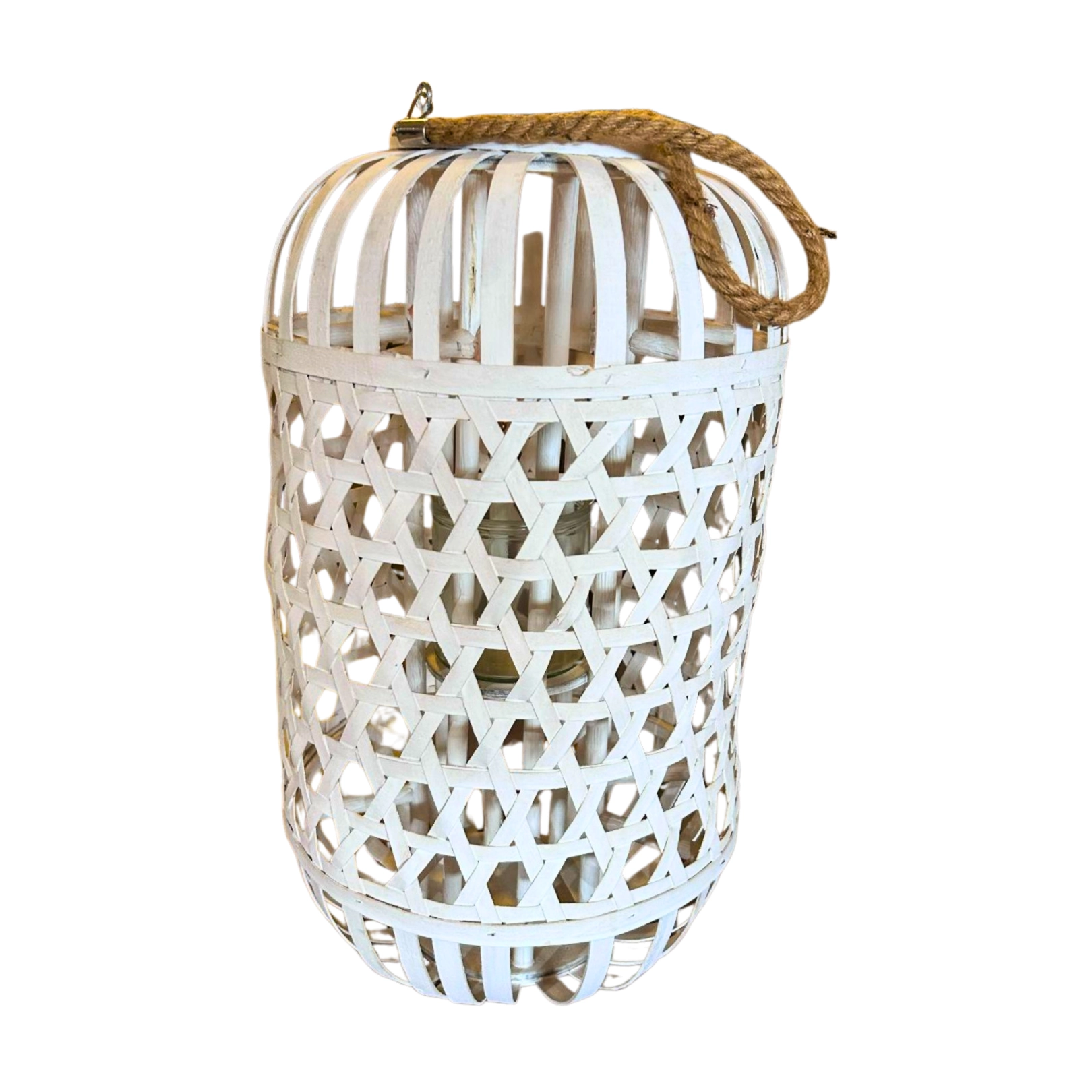 Linterna decorativa de madera blanca tejida. Aporta un toque artesanal y cálido a tu espacio.