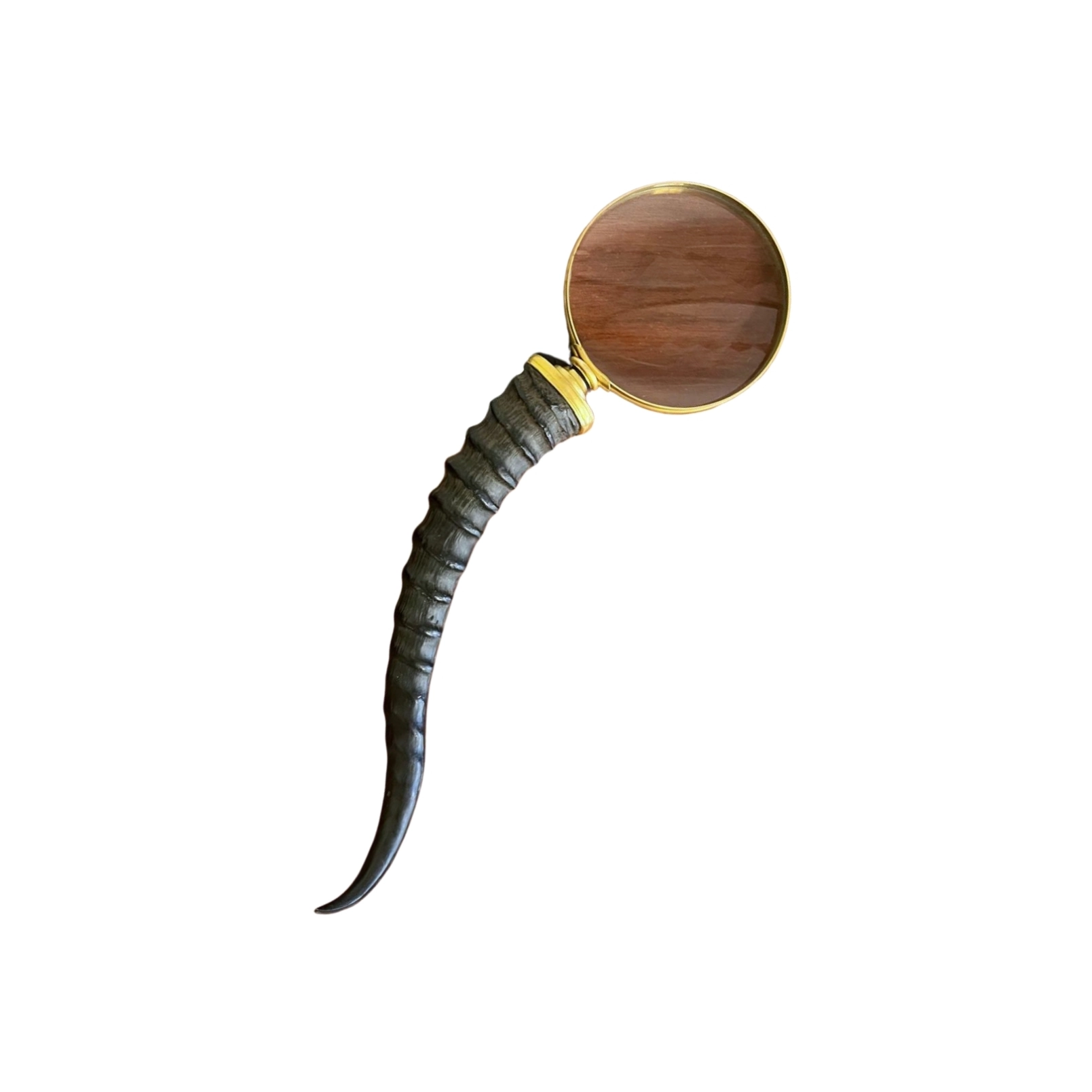 Lupa de diseño clásico con lente dorada y mango espiralado. Un accesorio elegante para explorar detalles con estilo.
