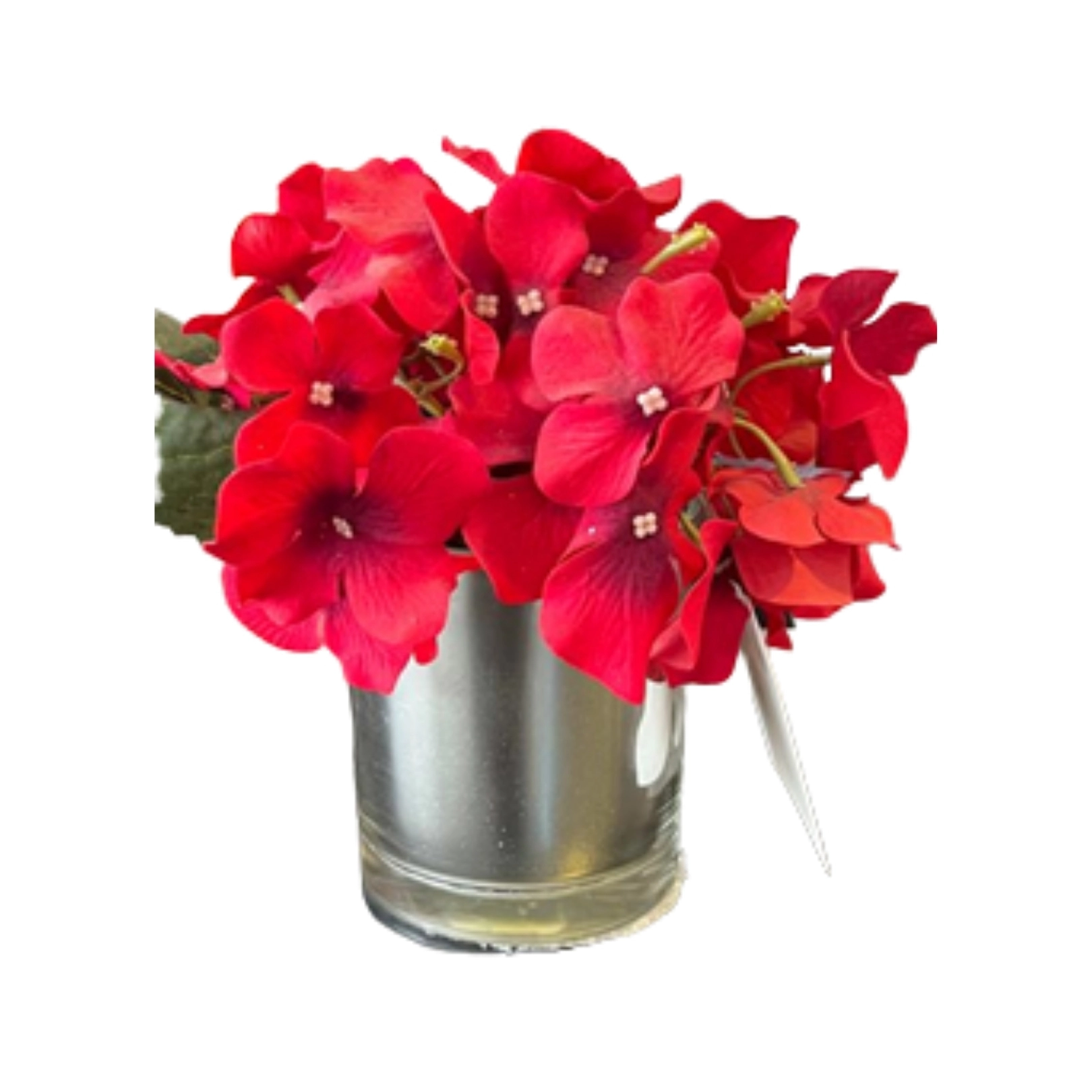 Hortensias rojas artificiales, vibrantes y detalladas, perfectas para añadir color a cualquier decoración.
