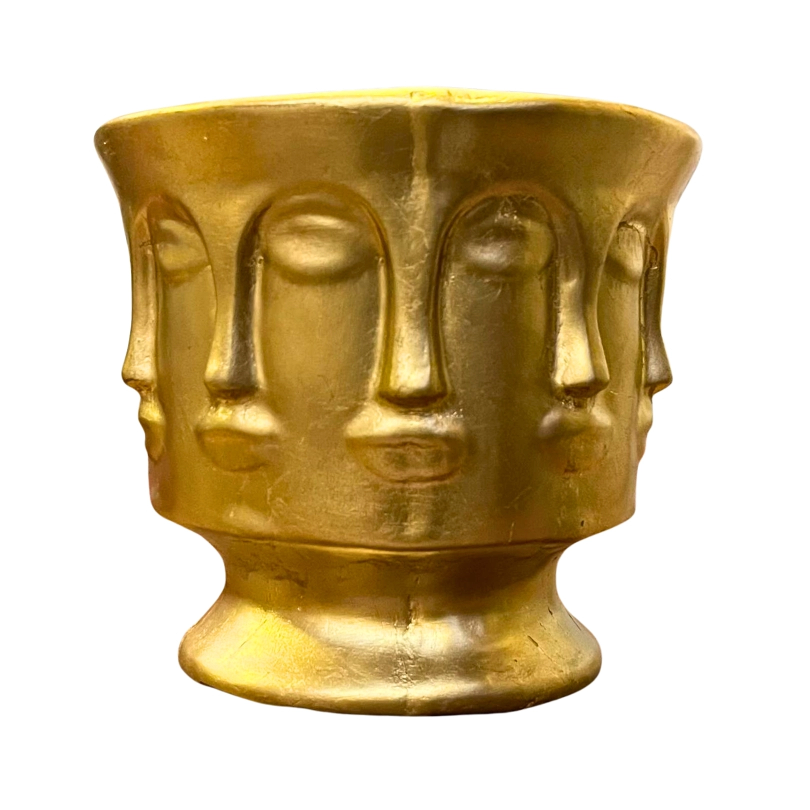 Maceta dorada con diseño de rostros estilizados. Un toque artístico y moderno para cualquier plantas.
