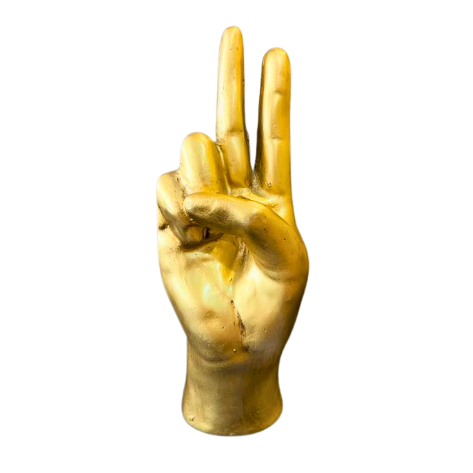 Escultura de mano dorada haciendo el signo de la paz. Un símbolo de unidad y estilo para cualquier espacio.