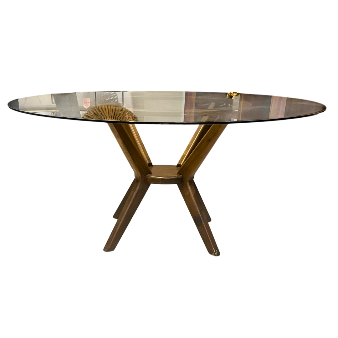 Mesa redonda de vidrio con base de madera oscura, elegante y moderna, ideal para cualquier espacio.