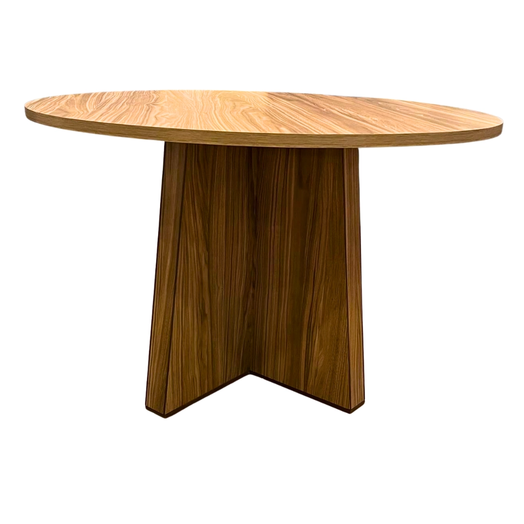 Mesa redonda de madera clara con base central geométrica de madera oscura. Perfecta para espacios modernos y acogedores.