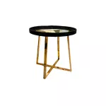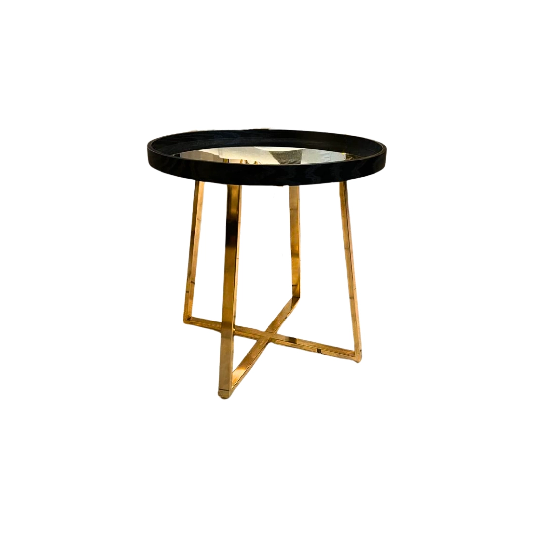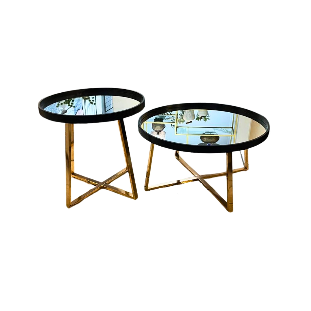 Mesa de centro redonda con tapa de espejo negro y marco dorado, ideal para añadir estilo y funcionalidad a tu sala de estar.