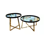 Juego de dos mesas ocasionales redondas. Superficies negras con borde dorado y bases metálicas doradas, diseño moderno y elegante.