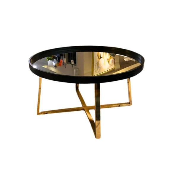 Mesa de centro redonda con tapa de espejo negro y marco dorado, ideal para añadir estilo y funcionalidad a tu sala de estar.