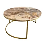 Mesas de centro circulares con tableros de mármol tipo beige y bases de metal dorado. Elegancia y funcionalidad para tu espacio.