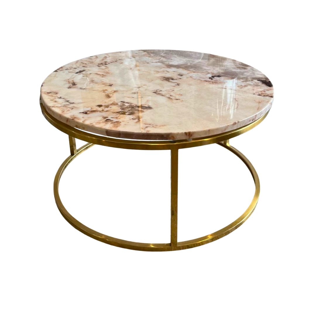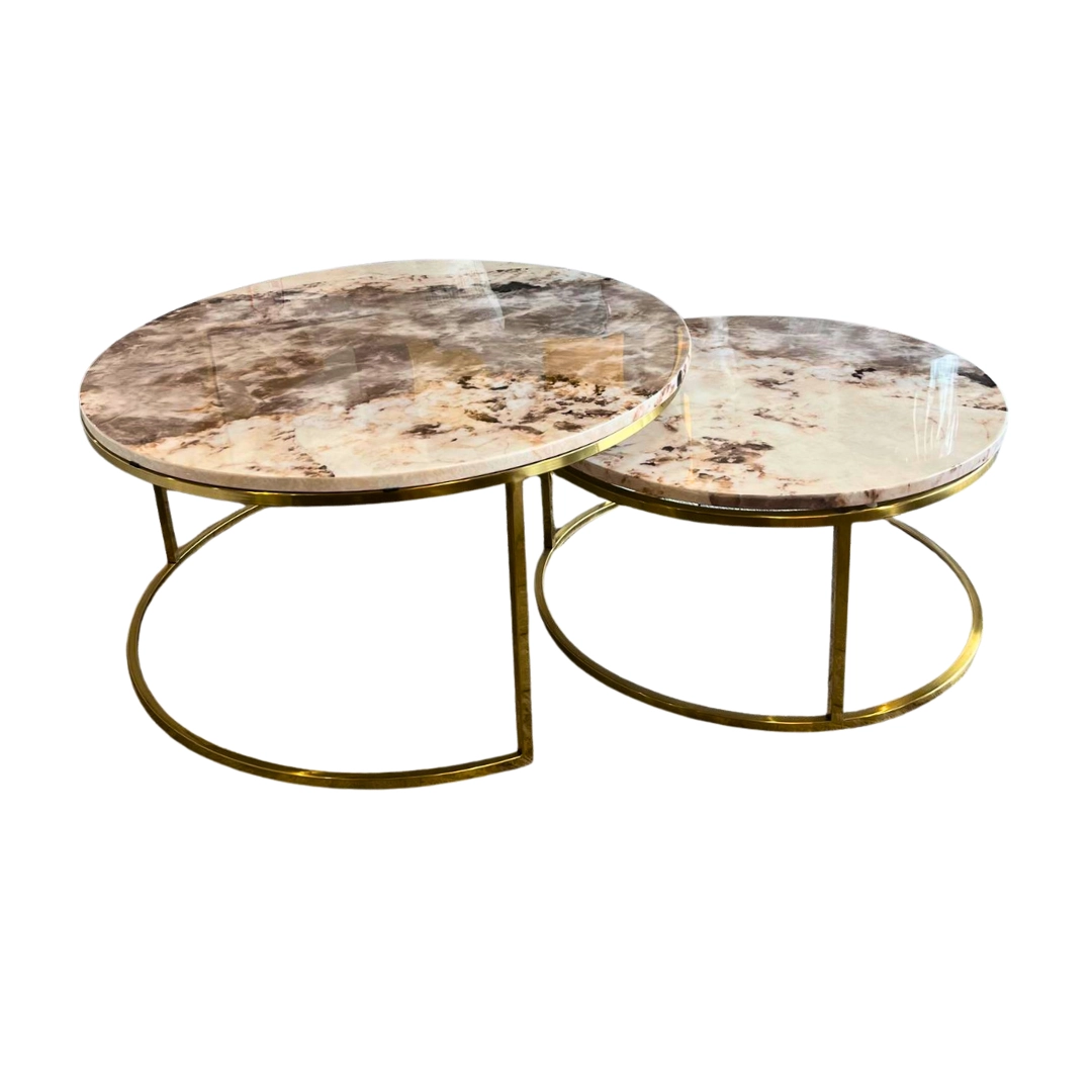 Mesas de centro circulares con tableros de mármol tipo beige y bases de metal dorado. Elegancia y funcionalidad para tu espacio.
