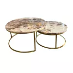 Juego de mesas de centro redondas con cubierta de imitación mármol y base metálica dorada. Diseño moderno y sofisticado para realzar tu sala.