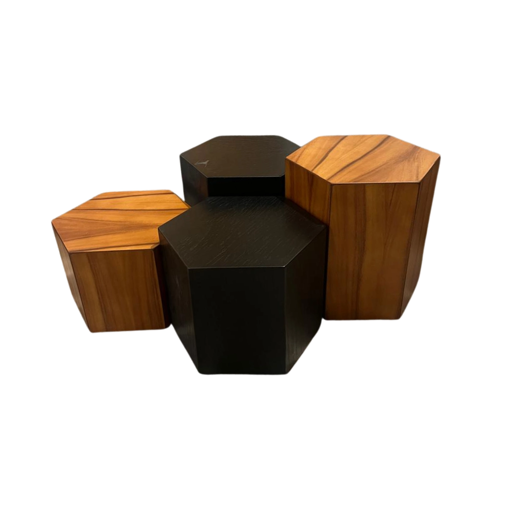 Conjunto de 4 piezas enchapado de tzalam mesas auxiliares hexagonales de diferentes alturas y colores. Ideal para añadir estilo y funcionalidad a tu espacio. Perfectas para cualquier sala de estar.