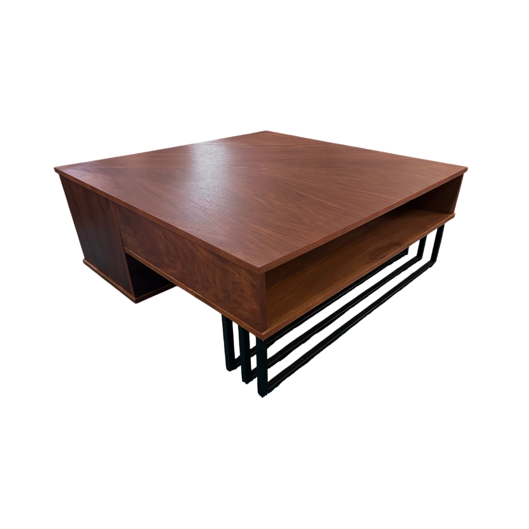 Mesa de centro moderna de madera oscura con patas metálicas negras y diseño minimalista, perfecta para cualquier espacio.