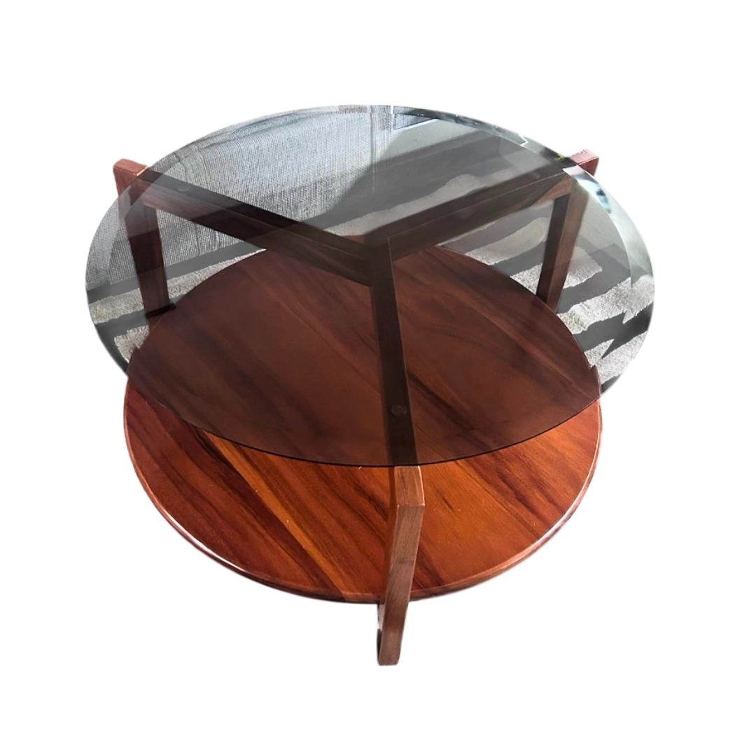 Mesa de centro redonda con superficie de vidrio y base de madera, que combina diseño moderno y funcionalidad para cualquier sala de estar.