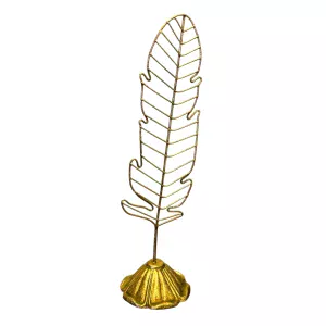 Adorno chico en forma de pluma de metal dorado, con un diseño elegante que aporta estilo a cualquier espacio.