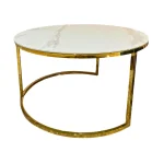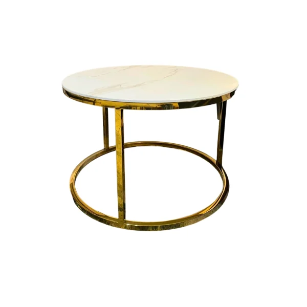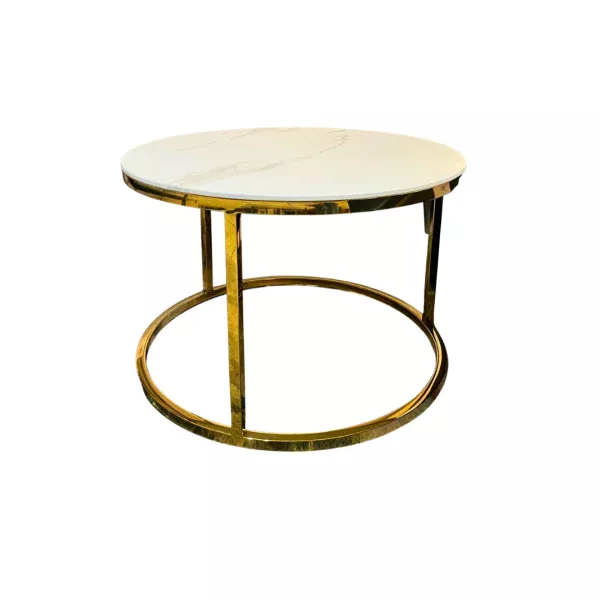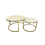 Juego de mesas de centro redondas con cubierta de imitación mármol y base metálica dorada. Diseño moderno y sofisticado para realzar tu sala.