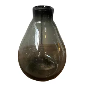 Florero de vidrio gris oscuro con forma de lágrima y acabado brillante, perfecto para decorar con elegancia cualquier espacio.