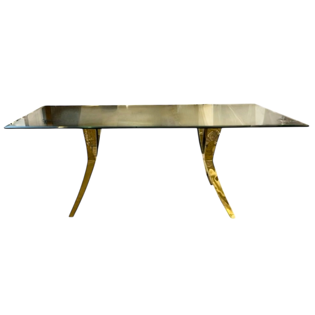 Mesa de cristal con patas doradas, de diseño curvo y elegante, ideal para espacios modernos.