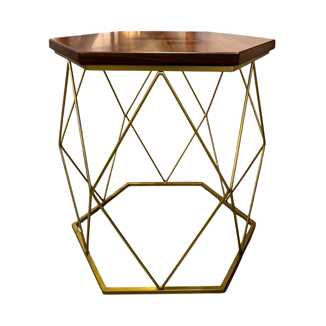 Mesa lateral hexagonal con tapa de madera oscura y base dorada geométrica. Un toque de elegancia moderna para cualquier espacio.