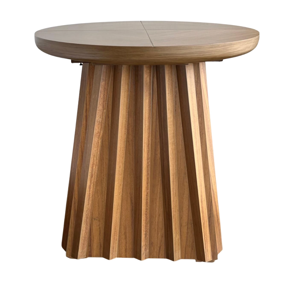Mesa lateral redonda de madera con base tronocónica y diseño moderno, perfecta para cualquier espacio.