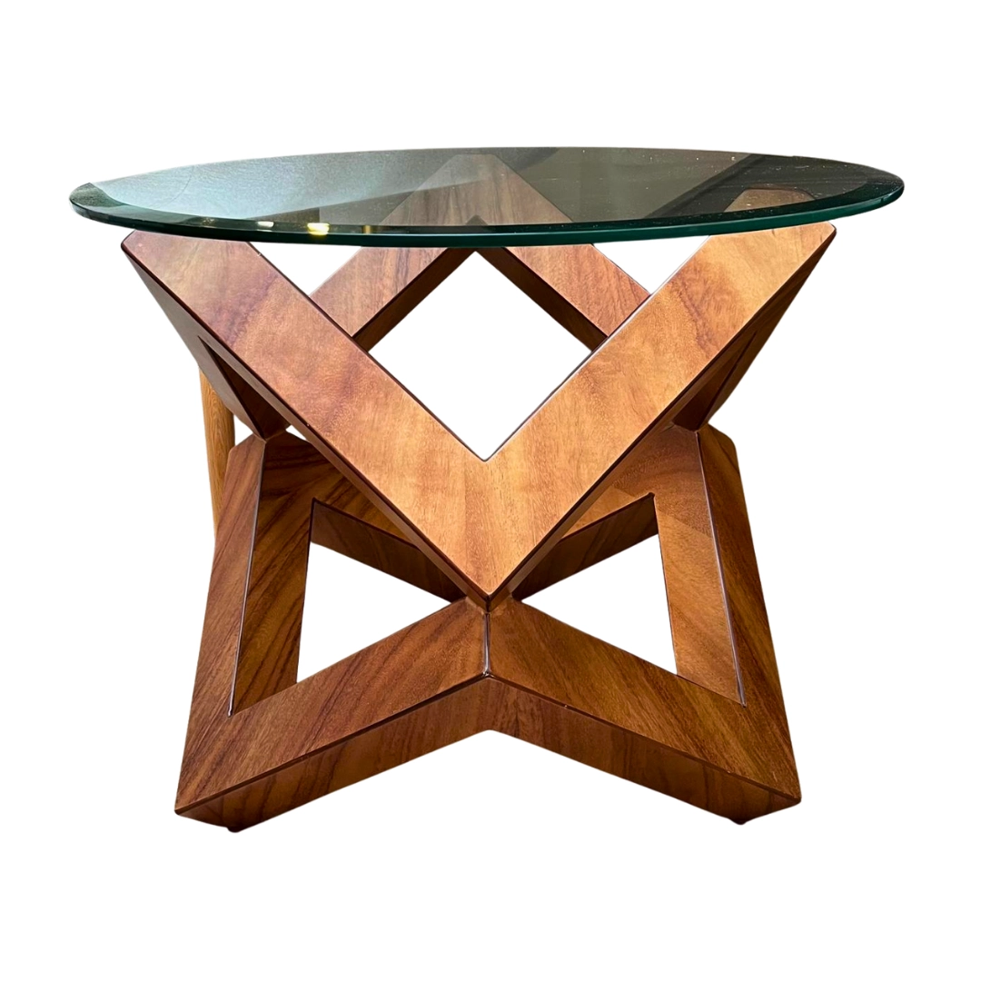 Mesa lateral de madera con diseño geométrico y tapa de vidrio. Elegante y moderna, ideal para cualquier espacio.