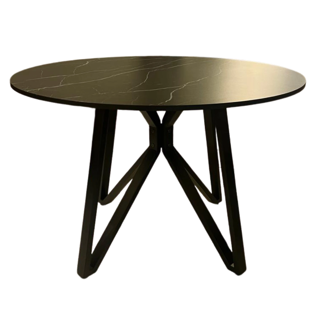 Mesa redonda de comedor con superficie de imitación mármol negro y base de MDF con melamina. Ideal para espacios modernos y elegantes.