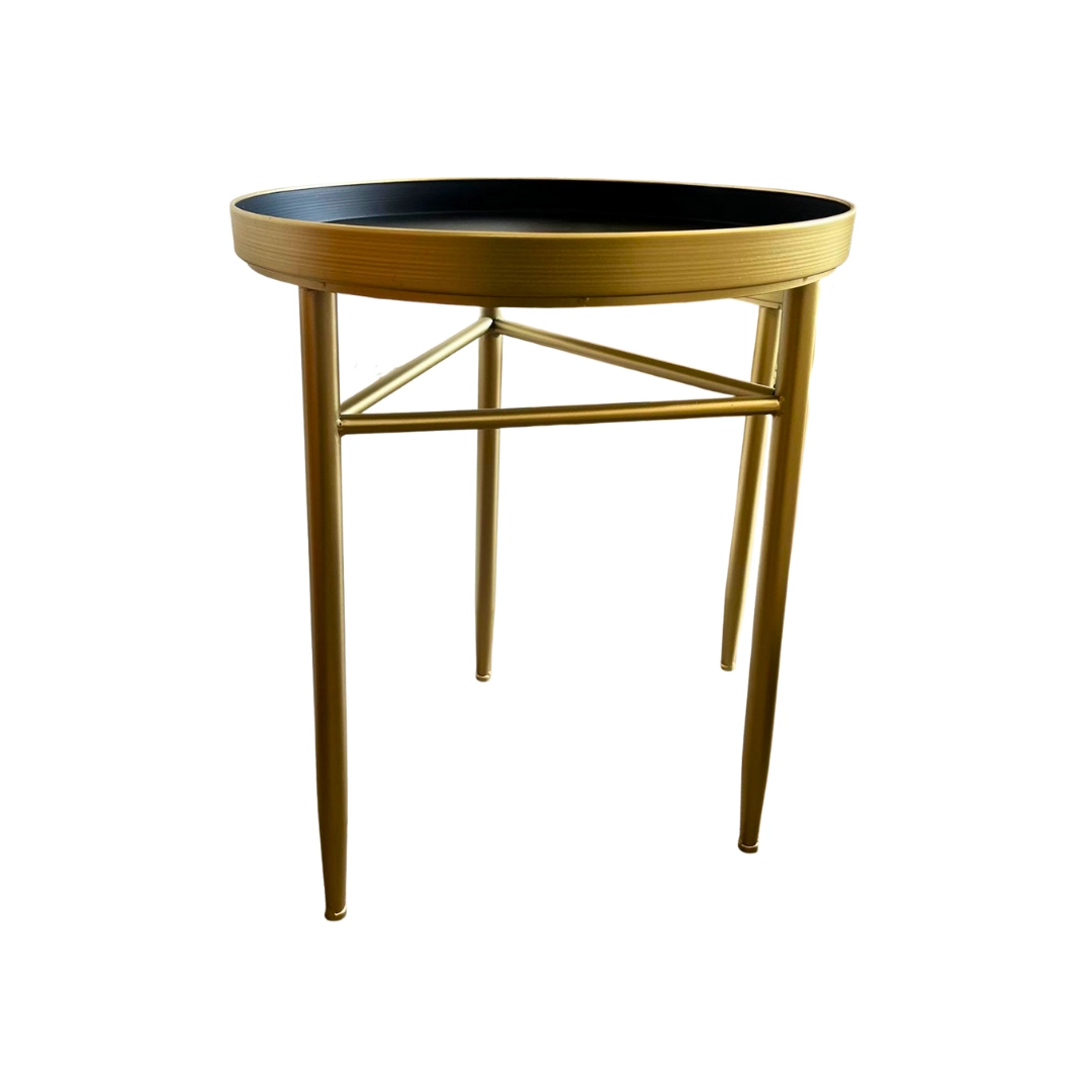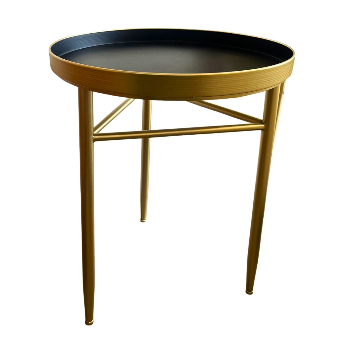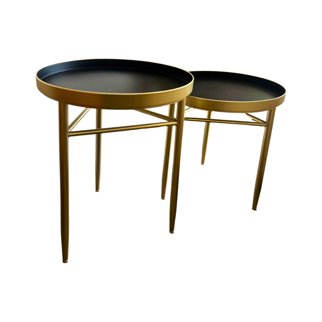 Juego de dos mesas ocasionales redondas. Superficies negras con borde dorado y bases metálicas doradas, diseño moderno y elegante.