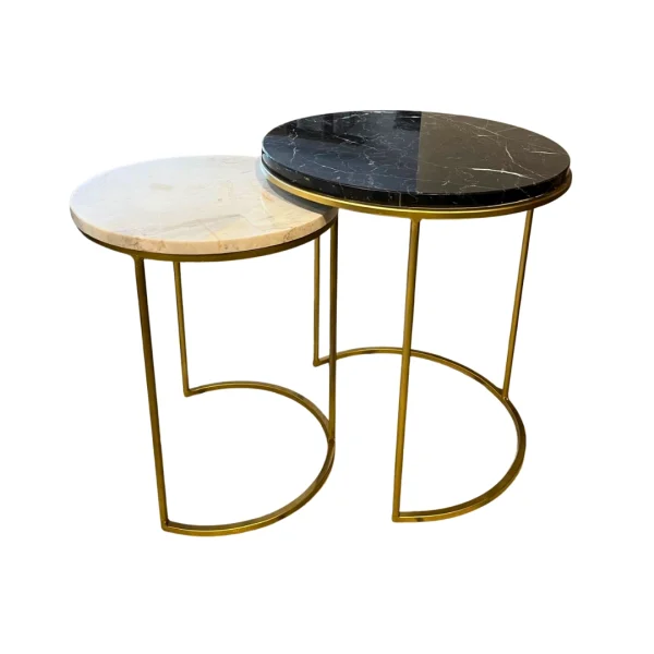 Juego de mesas auxiliares redondas anidadas, con tapa de mármol blanco y negro, y patas doradas, ideales para un toque moderno.
