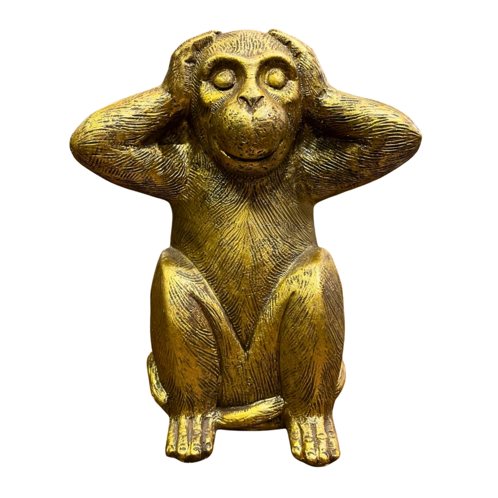 Estatua de mono dorado cubriéndose los oídos, perfecta para decorar con un toque elegante y divertido.