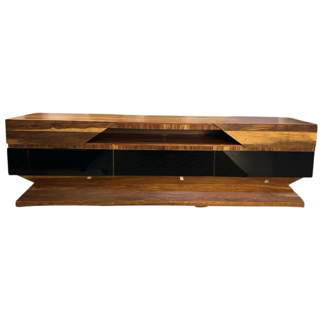 Mueble de televisión moderno en madera, con estante abierto y paneles de cristal negro, que combina estilo y funcionalidad.