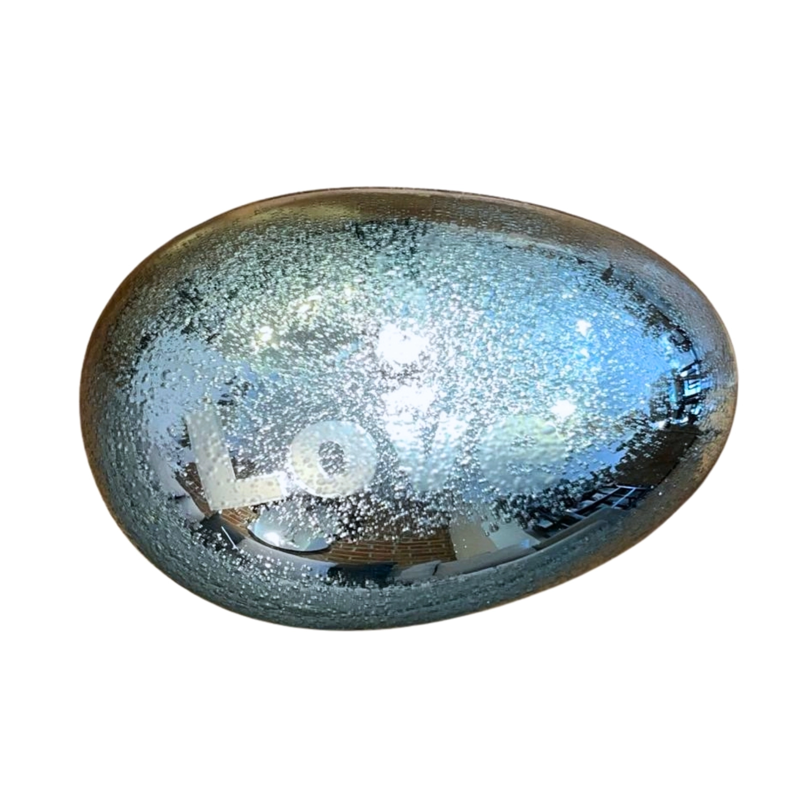 Piedra decorativa ovalada plateada con acabado brillante y la palabra “LOVE” grabada. Perfecta para añadir un toque moderno a cualquier espacio.