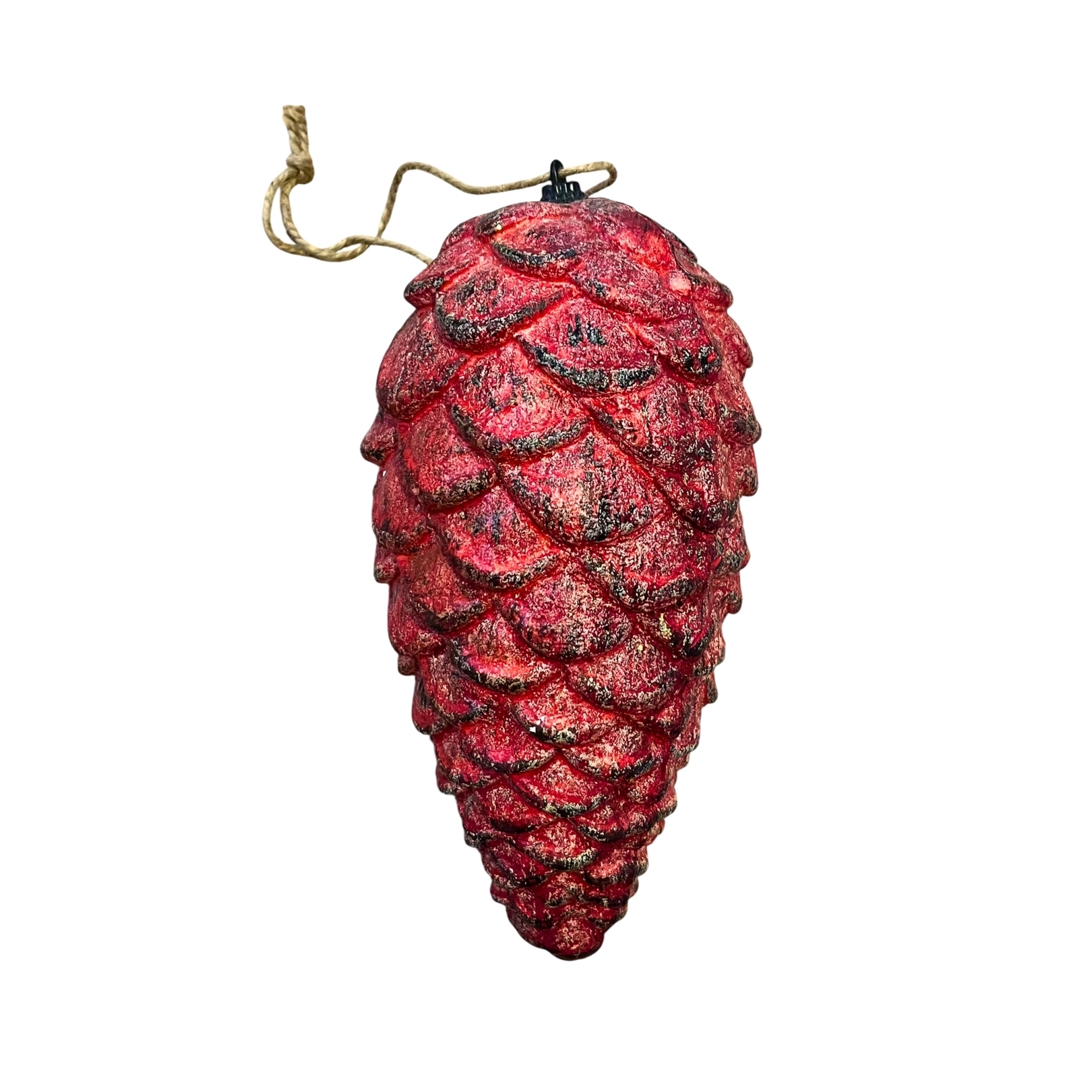 Adorno de piña roja con textura rústica. Un toque navideño y natural para cualquier árbol.
