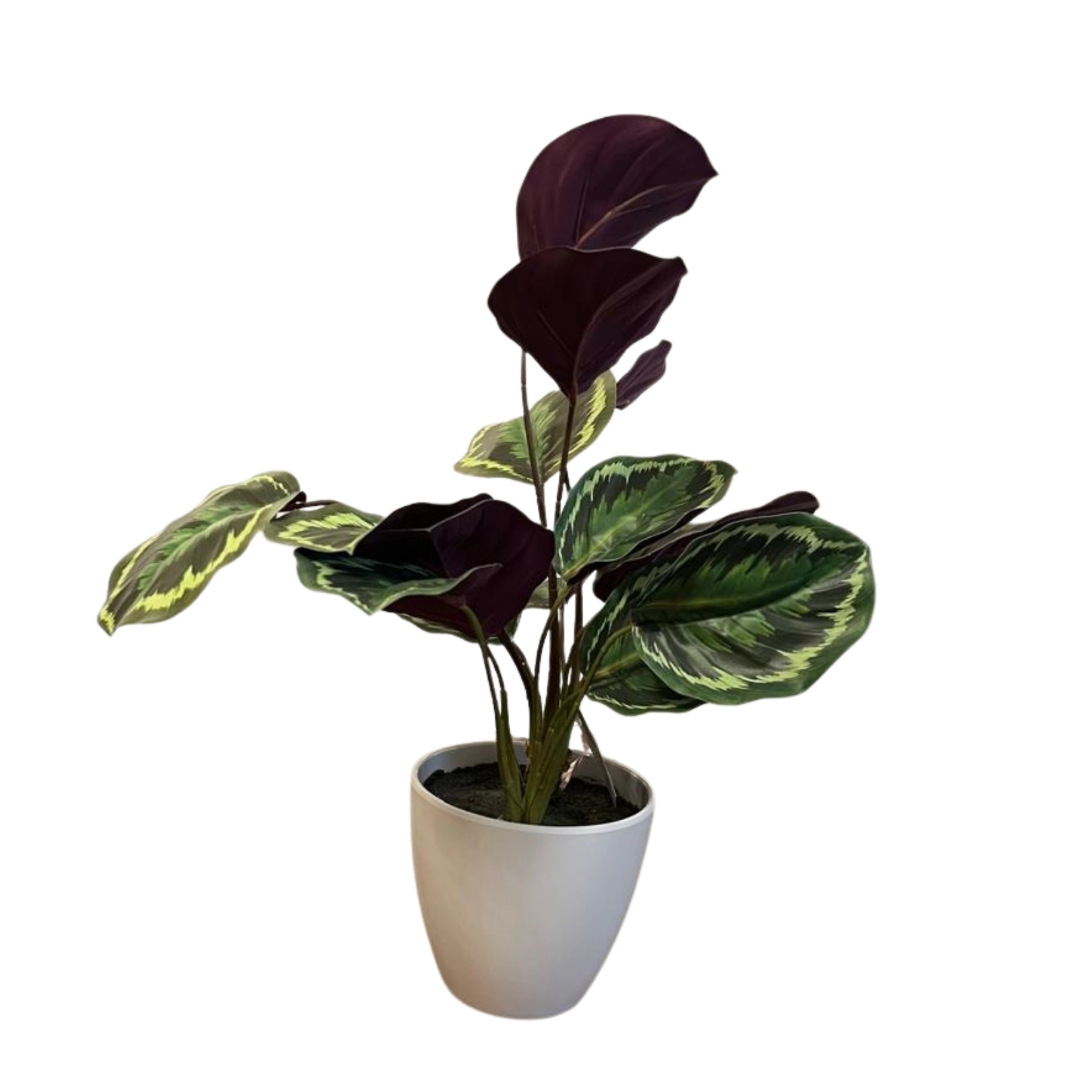 Planta de interior con hojas grandes y ovaladas en tonos verdes y morados, ideal para aportar frescura y estilo a cualquier espacio del hogar u oficina